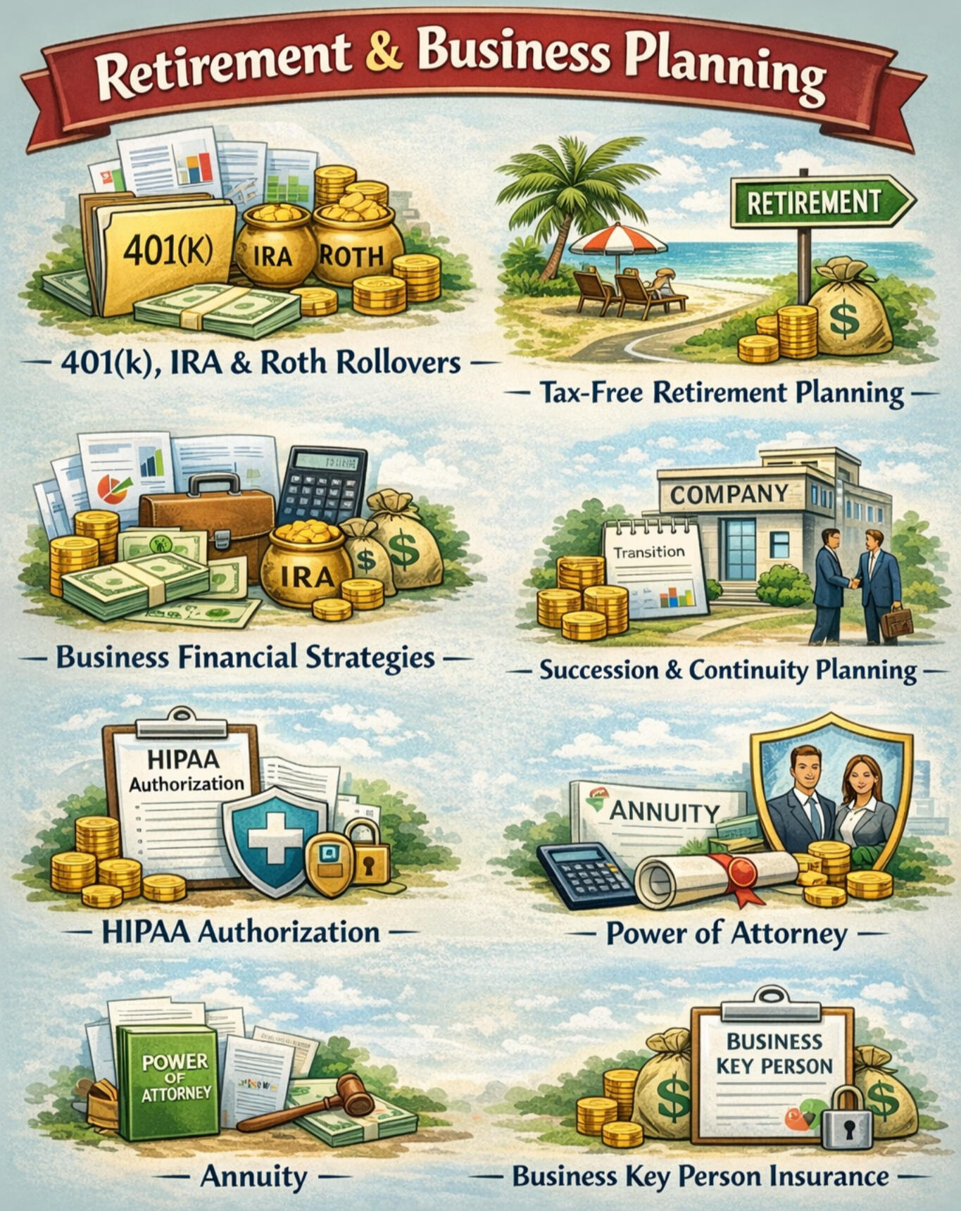 For Individual's and Business we offer strategic planning solutions for individuals and business owners, including retirement and business planning, 401(k), IRA, and Roth rollovers, tax-efficient retirement strategies, annuities, and key person insurance. We also support succession planning, continuity planning, and essential documents such as HIPAA authorizations and powers of attorney.